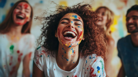 A group of joyful friends immersed in a creative paint party, showcasing laughter and vibrant colors, capturing the essence of fun and artistic expression in a candid moment.
