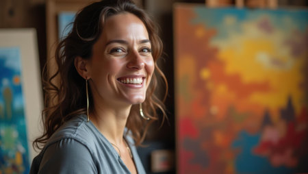 Candid moment with artist smiling experiencing joy and fulfillment from her artistic pursuit , Professional stock photo, AI generated photograph