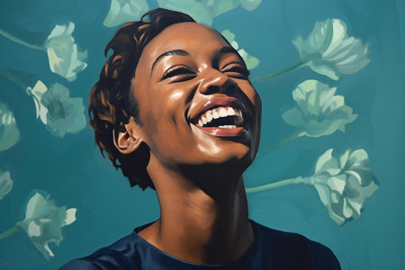 Joyful woman with mischievous grin amidst vibrant floral background