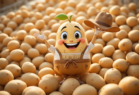 A cheerful cartoon potato character, dressed in overalls and a hat, stands amidst a large pile of potatoes. Generative Ai
