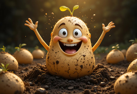 A cheerful cartoon potato character, covered in dirt, is depicted emerging from the soil. Generative Ai