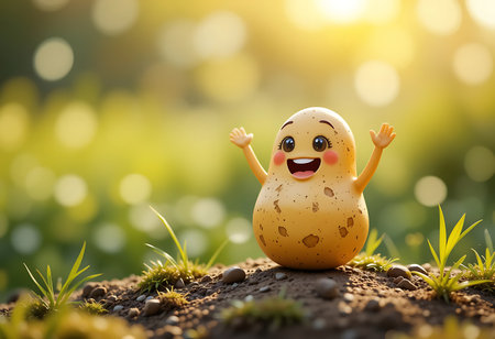 A cheerful, cartoon potato character, depicted in a light golden-yellow hue with brown spots, stands in a patch of dirt with vibrant green grass. Generative Ai