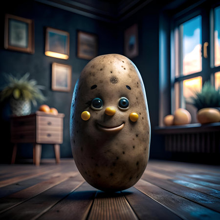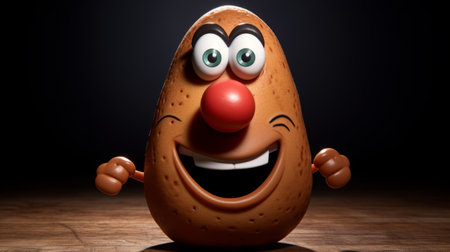 A whimsical potato on a rustic table embodies joy, inviting smiles and laughter