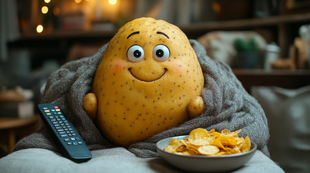 Funny potato character with TV remote control and chips in living room