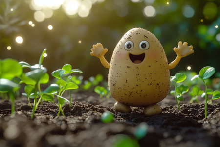 Cheerful potato character in lush garden surrounded by green seedlings and sunlit atmosphere