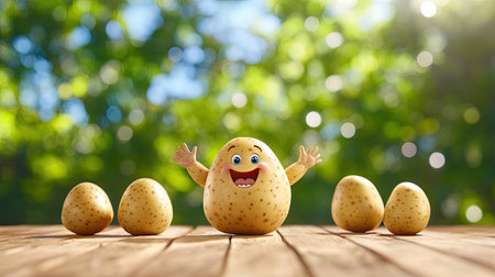 A cheerful cartoon potato character with a big smile and arms raised, surrounded by raw potatoes on a wooden table, set against a bright natural backdrop.