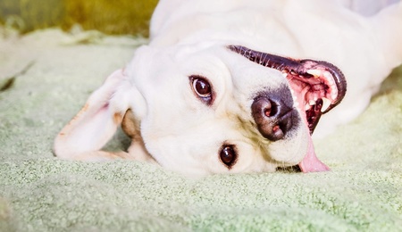 Close up of White dog looking at camera