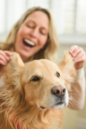 Portrait of woman with healthy golden retriever dog indoors in at home.