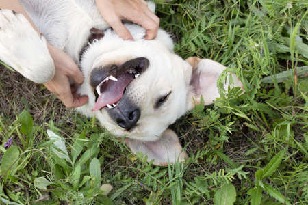 A fawn Labrador lies on back in the summer at sunset in the green grass and enjoys life. The dog is tired after active walk and wants to relax in the park. Animal body language, joy and happiness