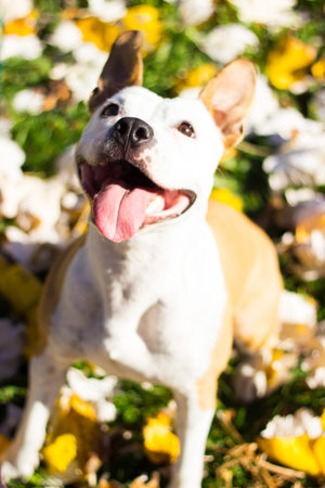 Portrait of a happy dog in the fall. Yellow bokeh background, autumn