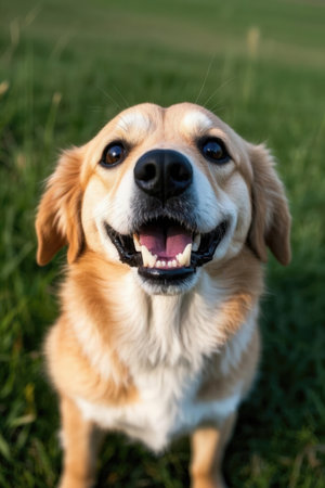 Pet care concept. Funny smiling golden retriever dog in the park