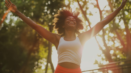 Woman with her arms in the air with her hands in the air. Generative AI.