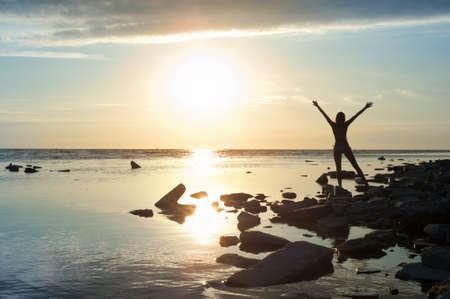 Silhouette of a woman with raised arms against a sunset sky over a sea background.
