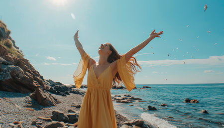 Woman with outstretched arms enjoying sunny day on rocky beach, breathing fresh air in the wind