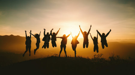 A vibrant group of friends jumps joyfully against a striking sunset backdrop. The silhouettes depict a moment of happiness, connection, and freedom.