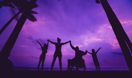Disabled man in a wheelchair with his family on the beach. Silhouettes at sunset. Concept