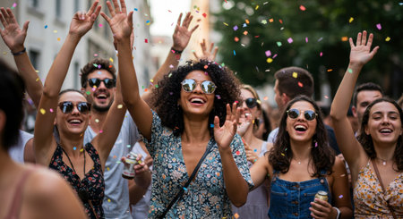 In the midst of a street carnival, diverse people, smiling and having fun, celebrate under a shower of confetti. The multicultural gathering adds vibrancy to the outdoor festivities,