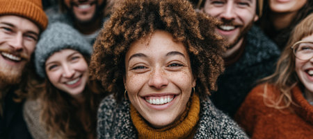 Diverse group of friends smiling together outdoors, dressed in cozy winter attire, capturing a moment of joy and connection in a lively and cheerful setting
