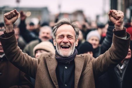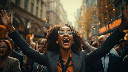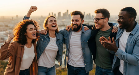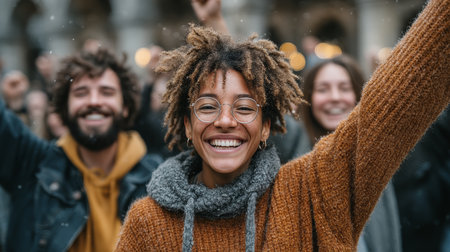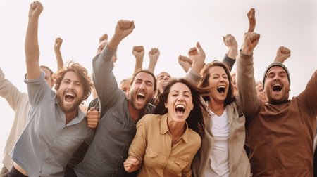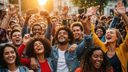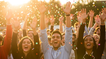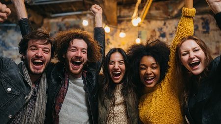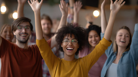 Happy group of diverse people celebrating together with raised hands, expressing joy and excitement in lively atmosphere. scene captures sense of community and togetherness