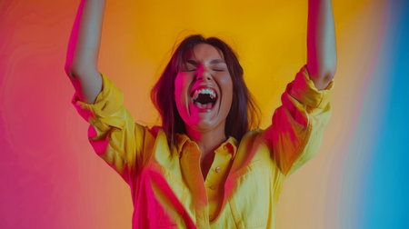 A woman beams with happiness, arms raised triumphantly as she celebrates her big lottery win. Set against a backdrop of colorful lights, her pure joy radiates in this exciting moment.