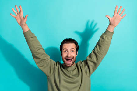Photo of hooray brunet millennial guy yell wear green shirt isolated on teal color background