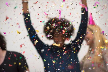 confetti party happy young people group celebrating new year eve while dancing and have fun at home