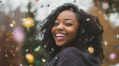 A young woman smiles brightly while standing outdoors surrounded by colorful confetti falling around her in a joyful celebration.