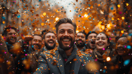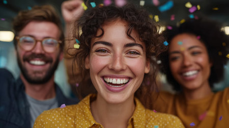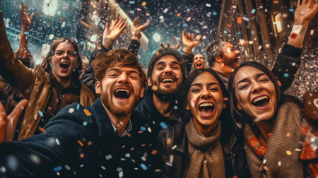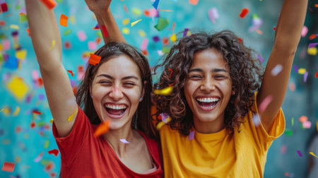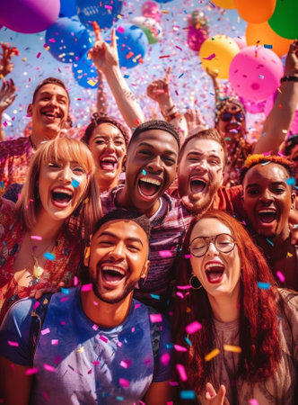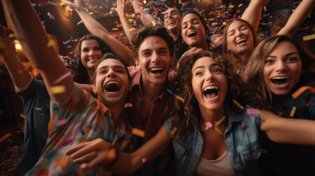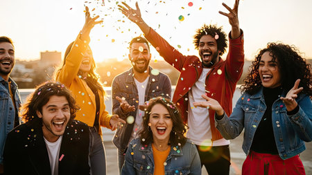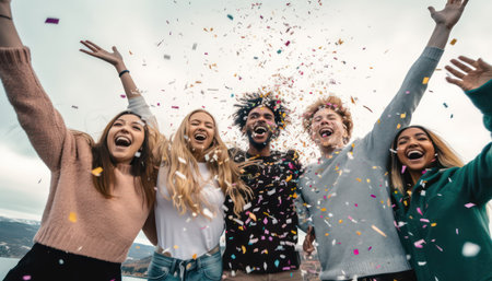 Diverse group of friends joyfully celebrating with confetti, showcasing their happiness and connection in a lively atmosphere filled with excitement and energy