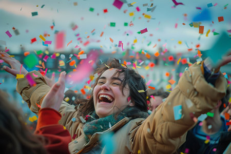 A group of people are seen outdoors celebrating by throwing confetti in the air. The image features natural lighting and a warm color palette. Diverse individuals exhibit expressions of joy. This image could be suitable for various uses including promotional campaigns, and social media content.