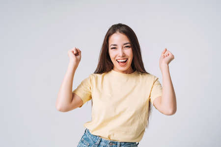 Excited agitated euphoric woman make win gesture