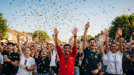 Group of men and women celebrating outdoors at a street party with colorful confetti falling around them, hands raised in the air.