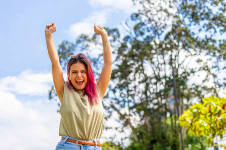 young latin woman celebrating with her hands up in the air