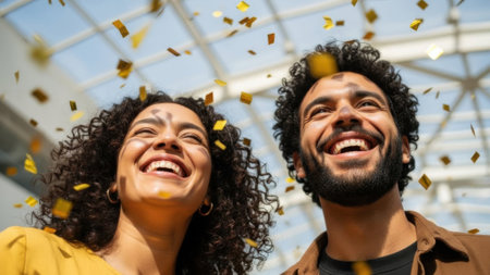 Low angle shot of a cheerful man and woman with curly hair smiling as golden confetti rains down on them in a bright, modern setting. A moment of pure joy and celebration.