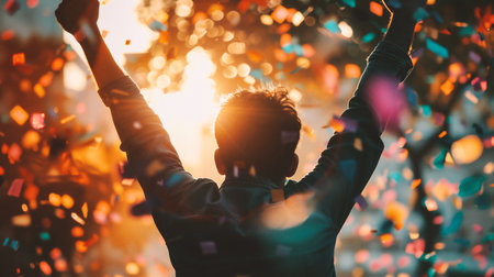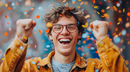 A man joyfully raises his arms in the air as colorful confetti falls around him.