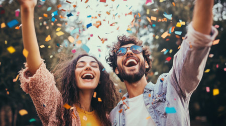 A man and woman are throwing confetti in the air, both smiling and laughing. Concept of joy and celebration, as the couple is likely celebrating a special occasion or milestone
