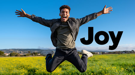 Young man jumping in a yellow field with the word Joy in the background