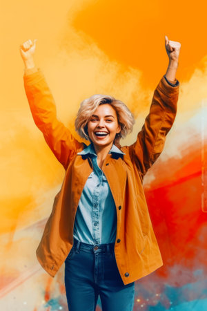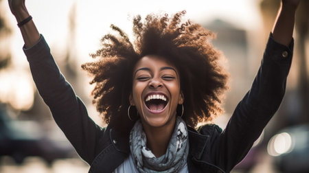 A vibrant young woman with curly hair beams with excitement, her arms raised in triumph against a playful background of colorful stars. This lively image radiates positivity and joy, capturing a moment of celebration and carefree happiness.