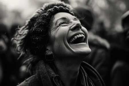A vibrant black and white image capturing a group of diverse individuals erupting in joyful laughter, showcasing genuine happiness and camaraderie.
