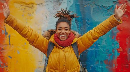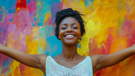 A joyful woman stands in front of a vibrant mural, smiling broadly with her arms outstretched. The colorful background adds energy and life to the cheerful moment captured.