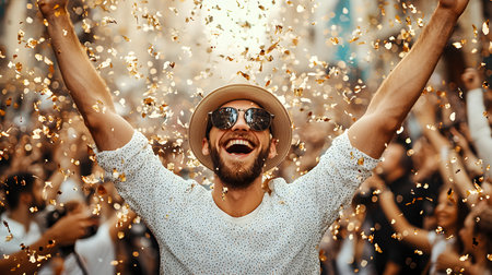 A man with a wide smile and sunglasses raises his arms in joy, surrounded by swirling confetti, reflecting a festive atmosphere. The background features an enthusiastic crowd.