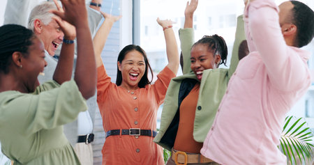 Happy creative people, meeting and celebration for teamwork, business or success together at office. Group of employees smile with hands in air for team achievement, promotion or startup at workplace