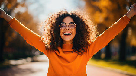 Joyful woman celebrating in nature with arms raised and smile