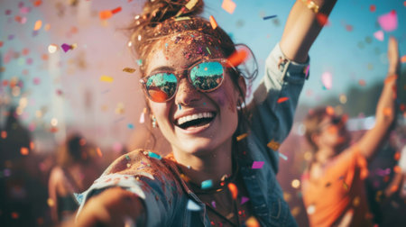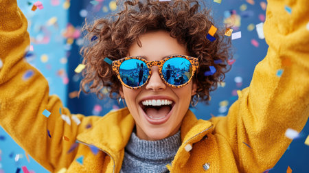 A Joyful woman celebrating with colorful confetti and stylish sunglasses