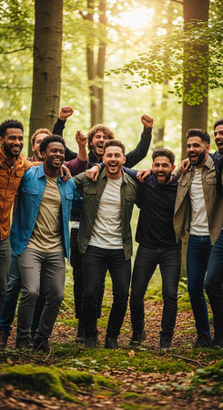 Group of happy friends having fun together in forest. Cheerful young men having fun outdoors.