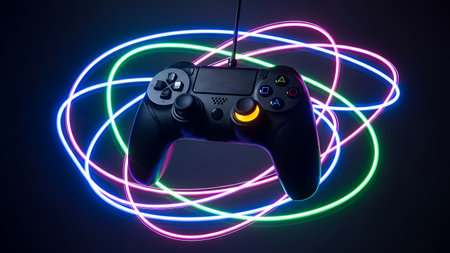 Sleek black game controller illuminated by vibrant neon light trails, highlighting modern gaming technology on a dark backdrop Buttons and joystick glow brightly