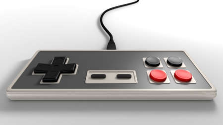 A regular vintage rectangular gaming controller with red and black buttons on an isolated white studio background