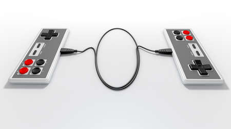 Two opposing vintage rectangular gaming controllers connected by their cords on an isolated studio background