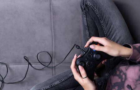 Playing games concept. Part body man with joystick play game on console . Male hands holding grey pad.
