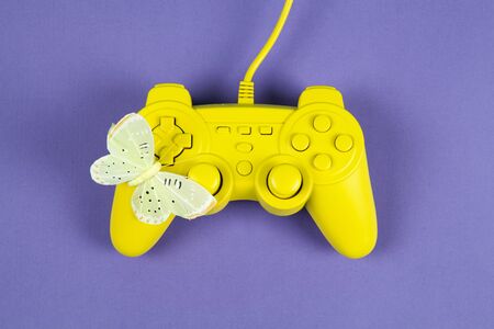 a yellow painted video game controller and a yellow butterfly on it on a plain purple background. Minimal color still life photography