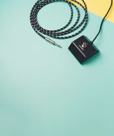 Electric guitar amp pedal with cable on a two tone pastel background. Concert equipment minimal template.